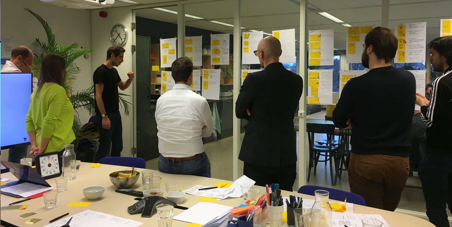 We took all the background knowledge we gained (in the meantime we did some research into competitors & benchmarks) into a sketch session based on the design sprint format. Is was incredibly helpful getting the ideas of the entire group of stakeholders on paper, and it served as a great starting point for the design of the UX concept.