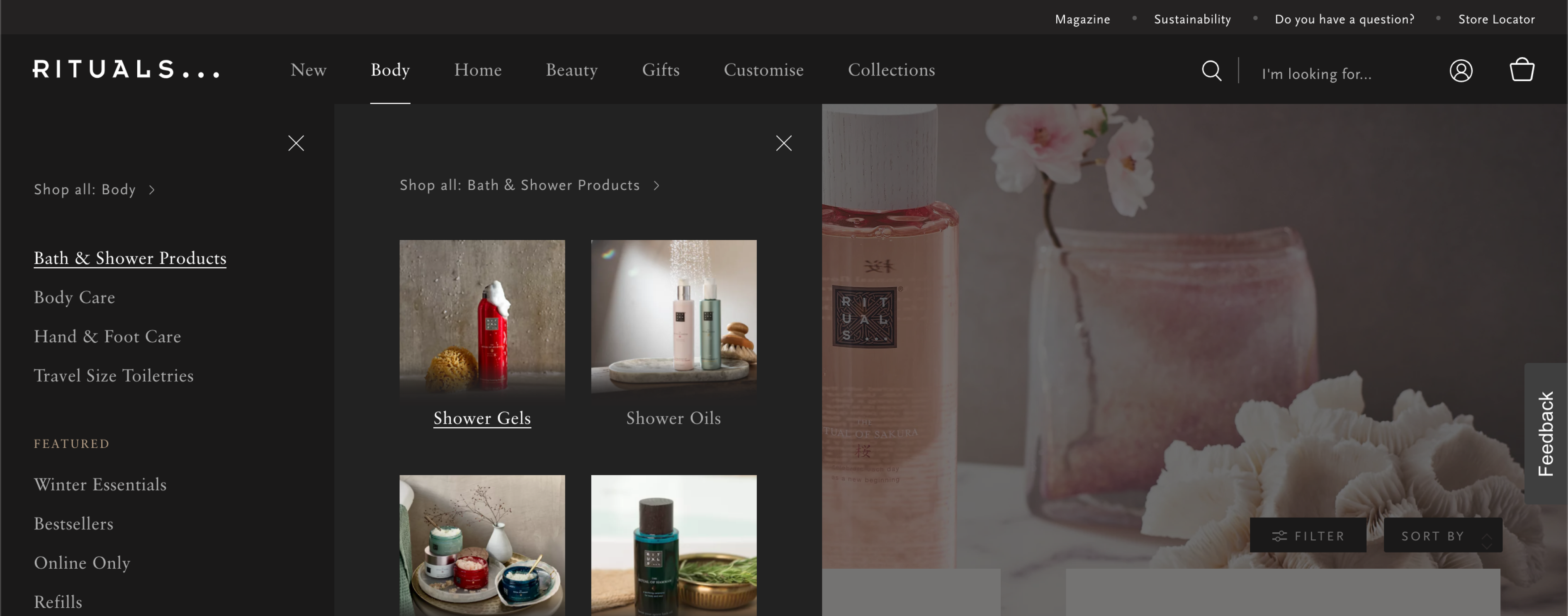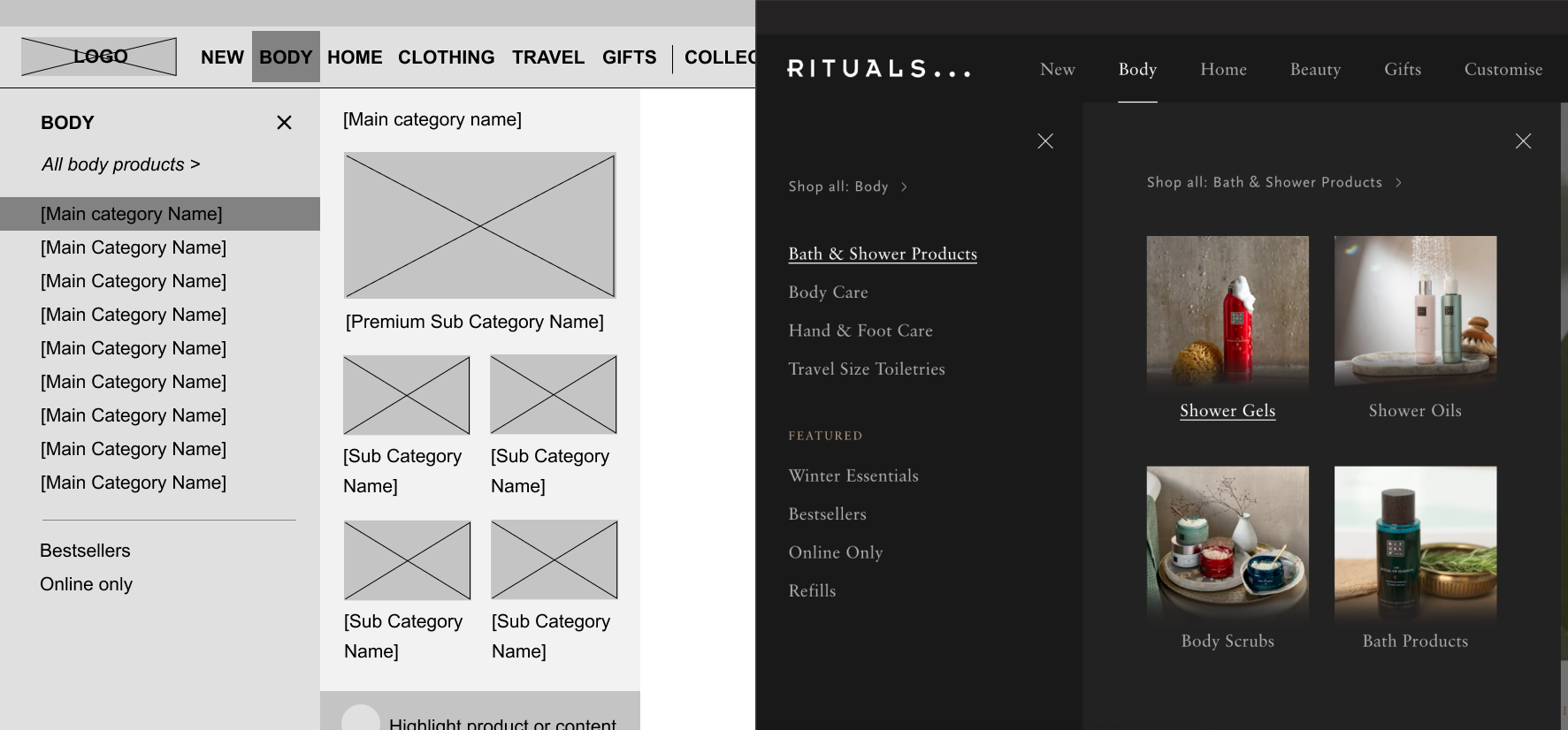During this project, in meetings with the e-commerce team, rituals stakeholders and the development team, we noticed the current backend system for filling the navigation was too rigid to incorporate all this. Requests from the team were fuelled by the wireframes and presentations for the navigation possibilities, and ultimately led to a go on updating the backend for the navigation to ensure ultimate sychnronisation