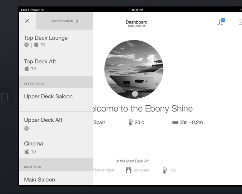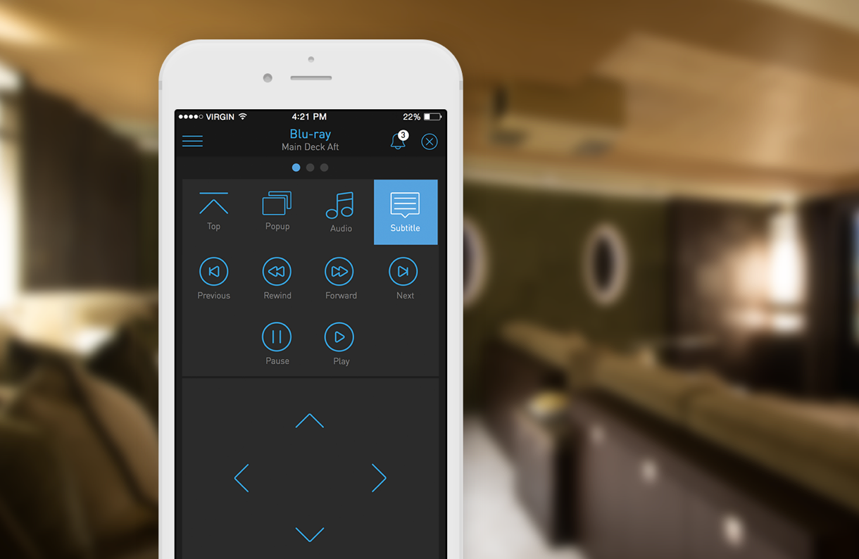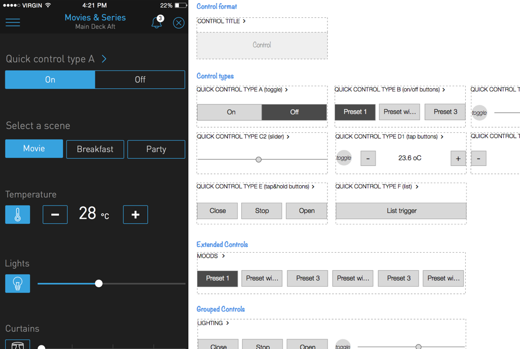 A major challenge was to make the most used controls accesable anywhere and everywhere. That's why I designed a 'quick acces panel' where the user can e.g. quickly dim the lights while browsing through the movie catalogue. The controls in the quick access panel are standardised and customisable, so the interface is personal and relevant for every user.